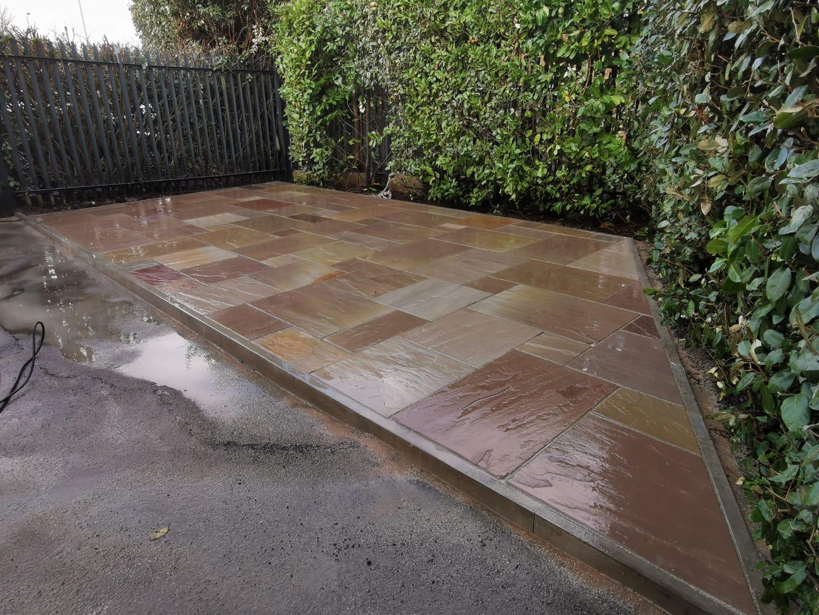 A recent install in Manchester for a commercial client. Turning empty car park spaces into the perfect staff seating area. We’ve used a natural riven raj green sandstone.