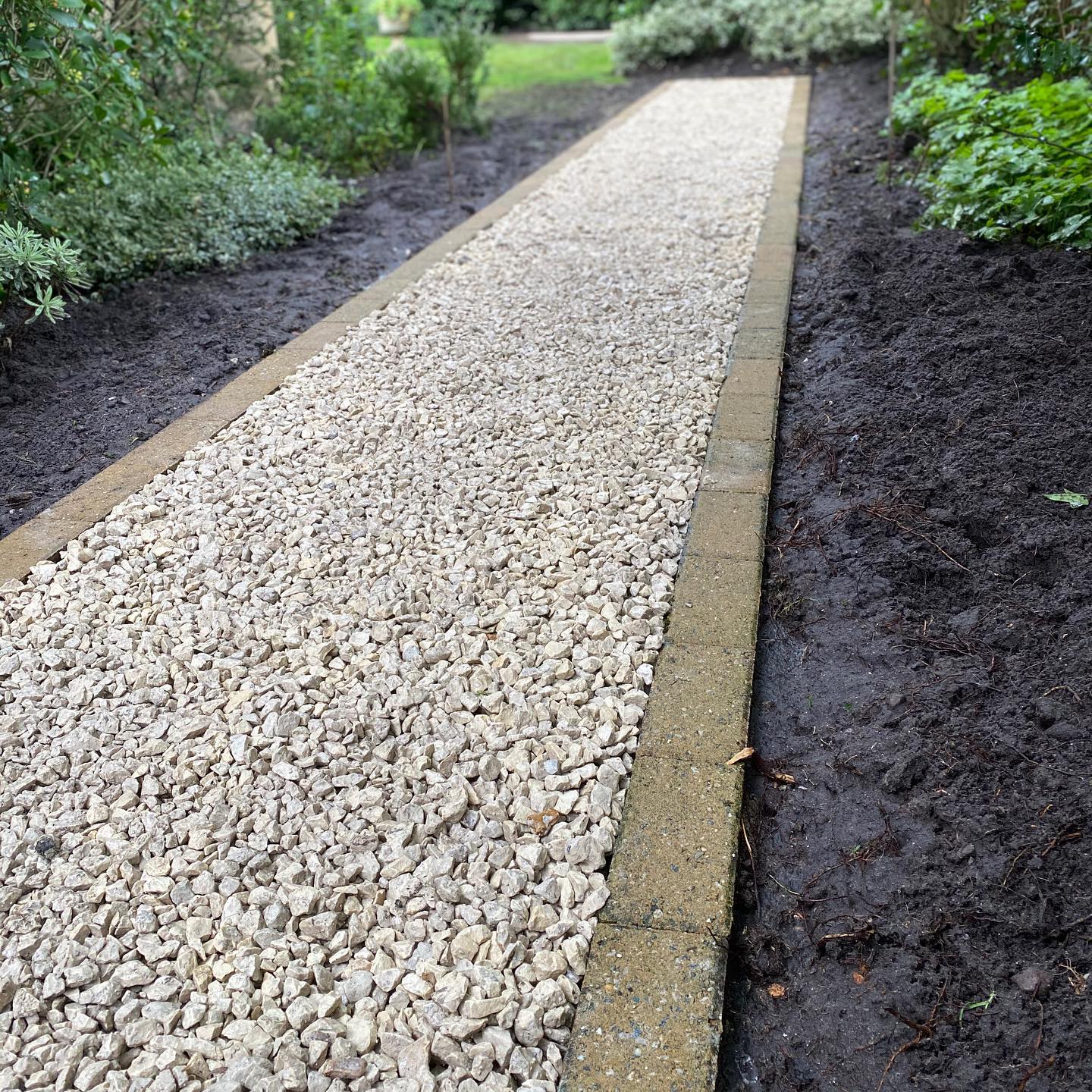 A small job here the landscaping team has recently completed. Turning a dark, wet patch of grass into an accessible pathway using cream Cotswold gravel and reclaimed buff pavers.